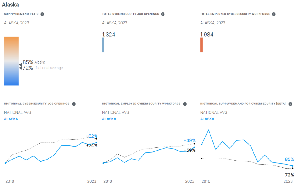 According to 2023 Cyberseek data, the state employed 1,984 people in cyber-related fields with total of 1,324 job openings from municipalities such as Anchorage (571) and Fairbanks (121).