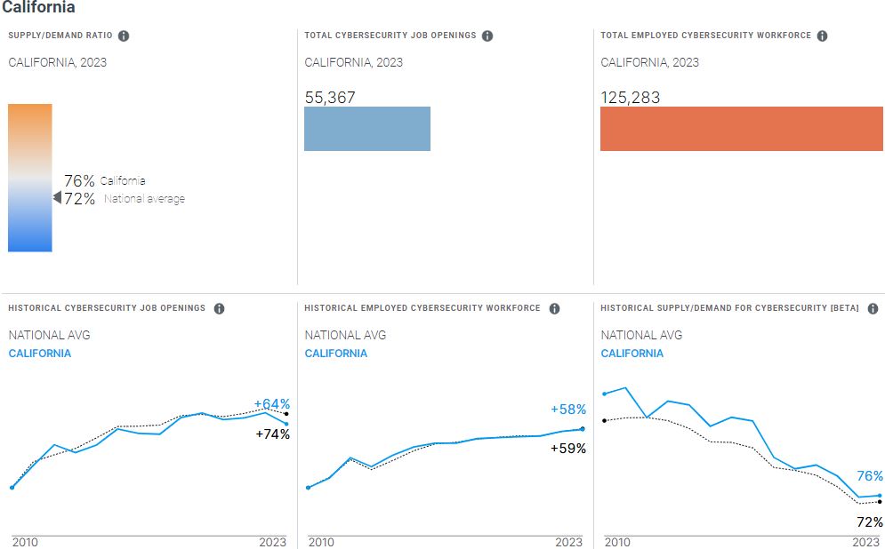 According to CyberSeek, there are 125,283 people employed in cybersecurity roles across California, and there are 55,367 cybersecurity job openings around the state.