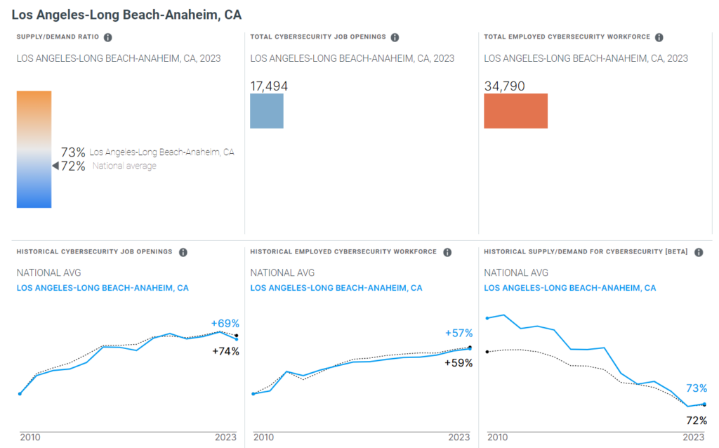 There is a high level of cybersecurity job demand in Los Angeles according to CyberSeek. Likewise, there is a supply-demand 73 percent ratio of cybersecurity jobs in Los Angeles. This means there is 27 percent vacuum left.