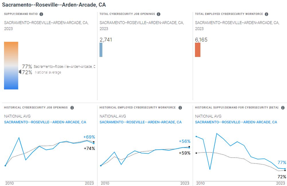Data from Cyberseek shows a high demand for cybersecurity jobs in the Sacramento-Roseville-Arden-Arcade area. While the cybersecurity job demand in the region is higher than the national average, there is also a higher supply 77 percent than the national average of 72 percent.