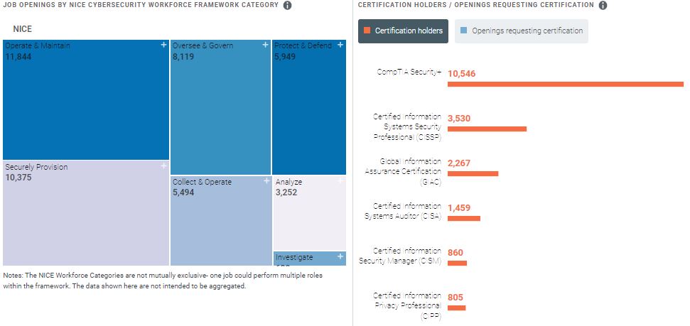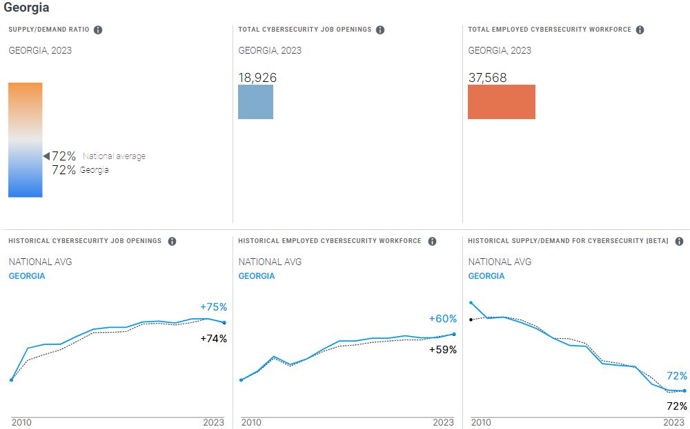 CyberSeek reports that there were 37,568 cybersecurity professionals employed in the state of Georgia from September 2022 through August 2023. There were also 18,926 new information security jobs posted by Georgia employers during that time.
