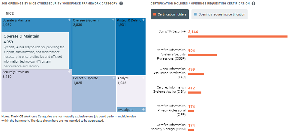 According to the Bureau of Labor Statistics, the average hourly wage for security analysts was $40.96 in 2022, with an average annual salary of $88,720. Cyberseek data shows that 12,927 people are currently employed in the cybersecurity field, with 6,312 openings for cybersecurity-related positions.