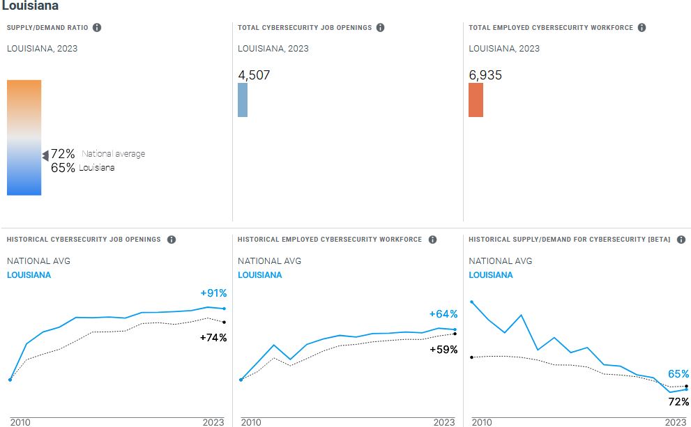 From September 2022 through August 2023, there were 5,731 job openings in Louisiana, and about 6,935 were employed in the cybersecurity industry, according to Cyberseek.