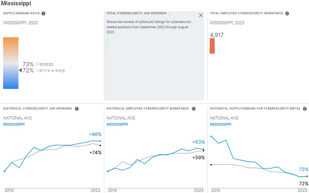 With a total of 2,491 job openings in Mississippi, about 4,917 people sustain employment in the cybersecurity field, according to Cyberseek‘s September 2022 to August 2023 data.