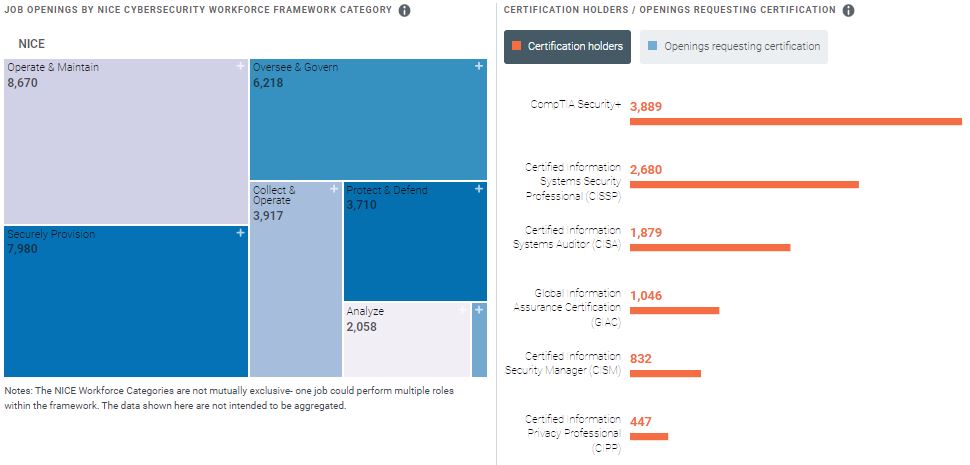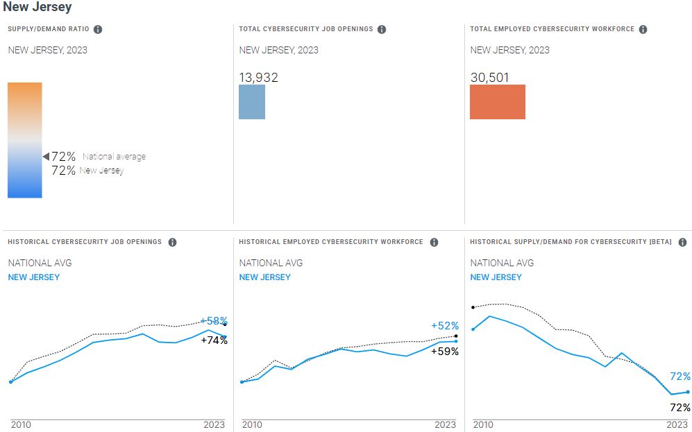 The cybersecurity workforce in New Jersey totaled 30,501 according to Cyberseek from September 2022 through August 2023. There were 13,932 new information security job openings posted by New Jersey employers.