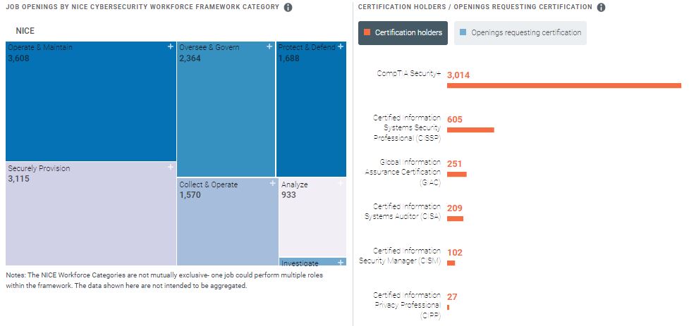 The density of cybersecurity professionals as compared to state citizens as a whole is among the lowest in the nation.