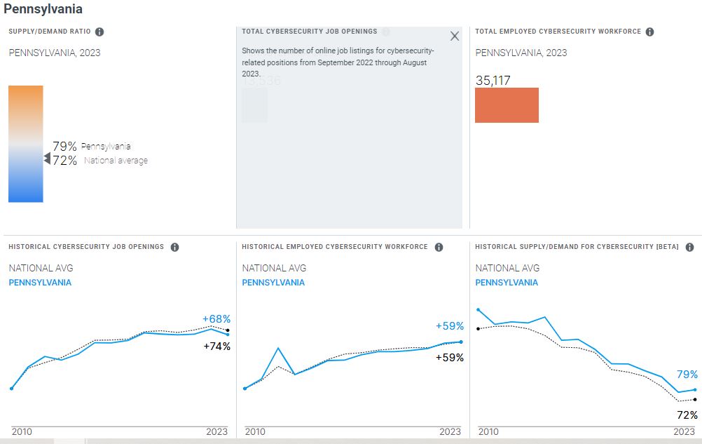 CyberSeek reports that there are currently 13,536 open cybersecurity jobs in Pennsylvania, compared to a total cybersecurity workforce of 35,117. Thus, the cybersecurity worker supply/demand ratio is 79 percent compared to a national average of 72 percent.