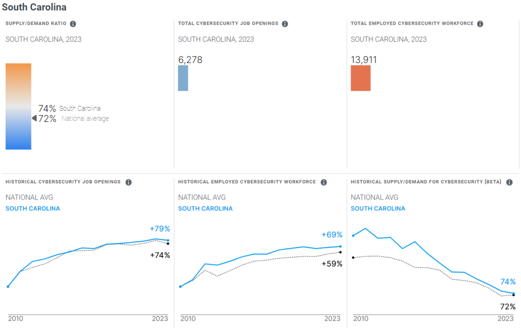 According to 2023 Cyberseek data, there are currently 6,278 cybersecurity positions open in South Carolina with 13,911 people being employed in cybersecurity workforce.