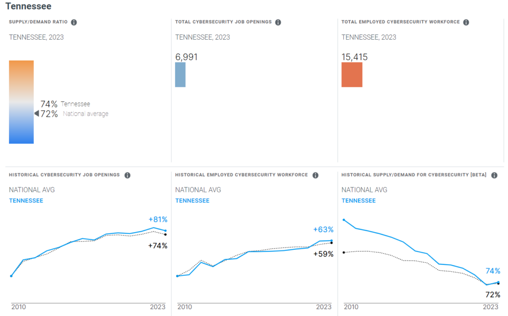 According to 2023 CyberSeek data, a cybersecurity job placement data aggregator, there are 6,991 cybersecurity positions open in the state of Tennessee with 15,415 currently employed.