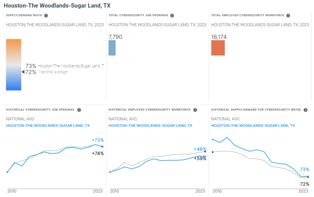 This means that companies in the city and the entire Houston-The Woodlands-Sugar Land metro area now demand cybersecurity experts. It’s no wonder that the region has a slightly higher cybersecurity supply (73 percent) than the national average (72 percent).